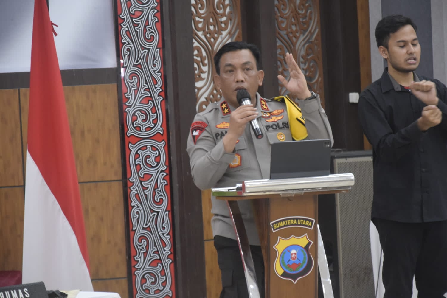 Kapolda Sumut, Irjen Pol RZ Panca Putra Simanjuntak memaparkan penanganan kasus sepanjang 2022 di Aula Tribrata Mapolda Sumut, Jumat (30/12/2022) petang. (Foto: Istimewa)